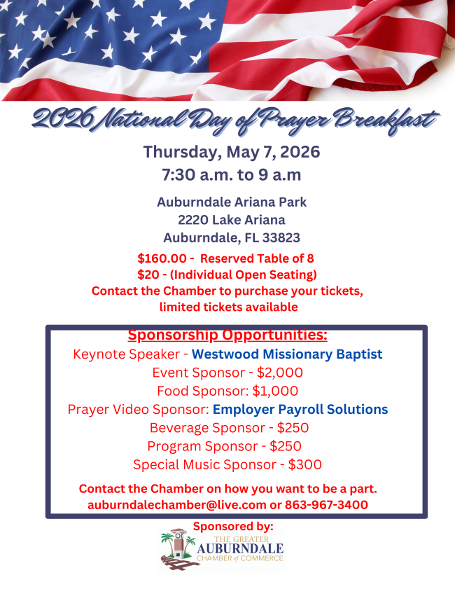 2026 Miss Auburndale Pageant Applications are now available. If interested please reach out to The Auburndale Chamber via email or phone or stop by the Auburndale Parks and Rec to pick one up.